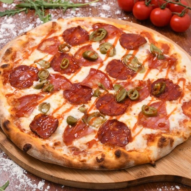 اخلطي صلصة الطماطم مع الثوم، زيت الزيتون، الأعشاب المجففة، والملح، والفلفل جيداً. سخني مقلاة كبيرة على نار متوسطة مع القليل من الزيت. ضعي شريحة من خبز التورتيلا في المقلاة، وادهني وجهها بالصلصة مع ترك حافة صغيرة بدون صلصة. رشي نصف كمية جبن الموزاريلا، ثم أضيفي نصف شرائح البيبروني والهلابينو. ضعي الشريحة الثانية من خبز التورتيلا، ووزعي الصلصة والحشوة على الوجه. غطي المقلاة، واتركي البيتزا تُطهى لمدة 4-5 دقائق حتى يذوب الجبن ويصبح خبز التورتيلا ذهبياً ومقرمشاً. قدمي البيتزا ساخنة مع السلطة أو الأطباق الجانبية المفضلة. تعلمي أيضاً: بيتزا بخبز التورتيلا المكسيكينشر لأول مرة على: kitchen.sayidaty.net