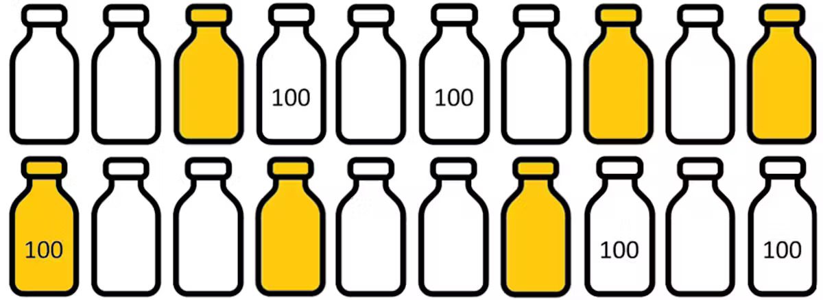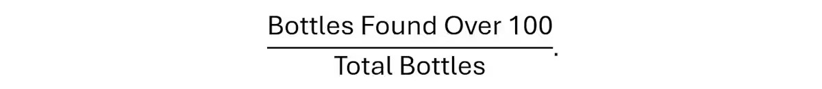 يوضح الرسم البياني أدناه موقفًا افتراضيًا حيث يتم إرسال 20 زجاجة إجمالاً، تم العثور على ستة منها (مشار إليها بالذهب) وواحدة منها يزيد عمرها عن 100 عام (يشار إليها بختم "100"). لذلك، تم العثور على واحدة من كل 20 زجاجة وعمرها يزيد عن 100 عام. (ملاحظة: هذه مجرد حسابات افتراضية، وليست بيانات حقيقية.)
