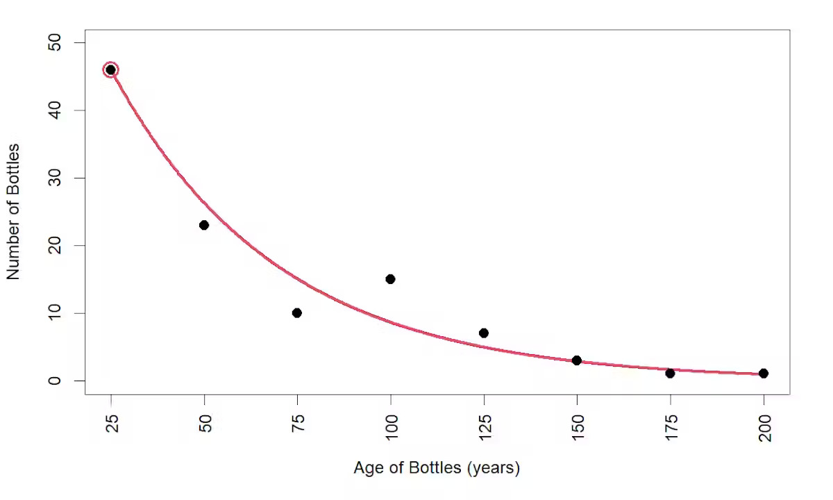 توفر هذه المعادلة تقديرًا لعدد الزجاجات التي تم العثور عليها لأي فئة عمرية محددة (حيث 25 = 0 إلى 25، 50 = 25 إلى 50 وهكذا). نحن مهتمون بالزجاجات التي يتراوح عمرها من 0 إلى 25 عامًا، لذا تشير المعادلة إلى أنه تم العثور على 46 زجاجة في هذا النطاق.