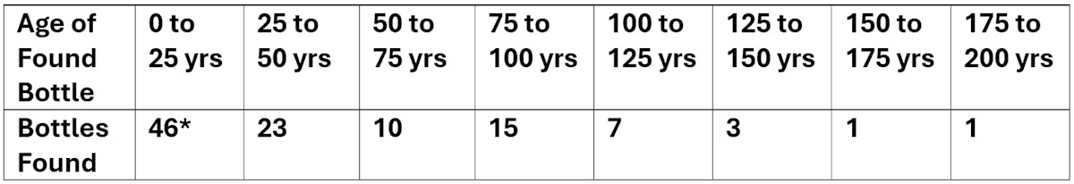 وبجمع هذا وكل الأرقام الموجودة في الجدول نحصل على إجمالي 106 زجاجات تم العثور عليها، منها 12 يزيد عمرها عن 100 عام، و12/106 تمثل حوالي واحدة من كل عشرة.
